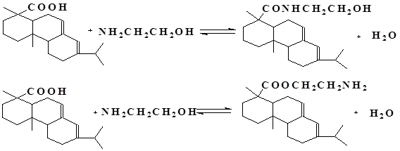 Амиды дитерпеновых кислот получают взаимодействием смоляных кислот или их производных с первичными или вторичными алифатическими и ароматическими аминами. Реакция протекает в отсутствии растворителя при температуре 170-180 0С /15/.