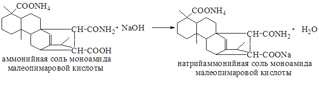 В основе получения амидо-аммониевой соли малеопимаровой кислоты в качестве клеевой канифольной композиции лежит модификация канифоли малеиновым ангидридом, реакция аммонолиза малеинизированной канифоли и последующая реакция частичной нейтрализации свободных смоляных кислот канифоли раствором едкого натра (21% конц.).