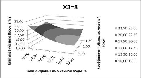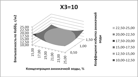 Рисунок 4.2 - Зависимость впитываемости по Коббу от параметров проведения реакции получения амидо-аммонийной соли на основе малеинизированной живичной канифоли