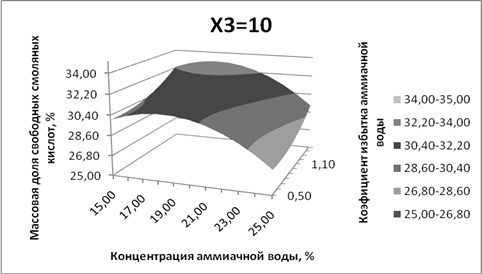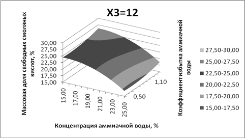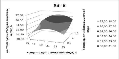 Рисунок 4.4 - Зависимость массовой доли свободных смоляных кислот от параметров проведения реакции получения амидо-аммонийной соли на основе малеинизированной живичной канифоли