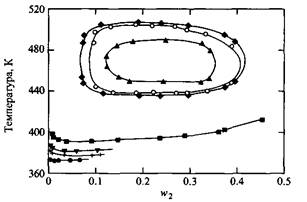 Фазовые диаграммы систем поли - вода для ПЭГ разной молекулярной массы. Снизу вверх молекулярные массы ПЭГ равны IO6, 2 104, 1.4 · 104, 8 103,2270,2250 и 2160.