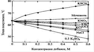 На помутнение сильно влияет присутствие других растворенных веществ. Как видно, электролиты могут как повышать, так и понижать точку помутнения и соответственно могут называться всаливающими и высаливающими. Это объясняется особенностями взаимодействия полимера или НПАВ с растворенным веществом. Эффект более выражен для анионов. Некоторые анионы, например SCN-, проявляют преимущественное сродство к полимеру или поверхностно-активному веществу, а не к растворителю, вследствие чего накапливаются вблизи оксиэтиленовых групп. Другие, например СГ, не обладают такой склонностью, и их содержание вблизи оксиэтиленовых групп понижено. В первом случае растворимость НПАВ увеличивается и, как следствие, повышается точка помутнения, в то время как во втором - все происходит наоборот.