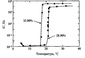 Водные растворы блоксополимеров ЭО-ПО становятся очень вязкими в узком температурном интервале. Представлены зависимости модуля запаса G' от температуры для двух систем, различающихся концентрацией сополимера.