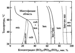 Фазовая диаграмма системы триблок-сополимер ЭО-ПО-ЭО - вода. Обозначения: mic и rev mic относятся к фазам изотропных растворов; cub, hex и Iam обозначают кубическую, гексагональную и ламелярную жидкокристаллические фазы соответственно.