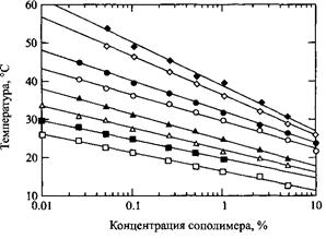 Мицеллообразование в растворах блок-сополимеров типа ЭО-ПО при повышении температуры происходит при значительно более низких концентрациях. Приведены зависимости для плюроников, различающихся по полярности и молекулярным массам