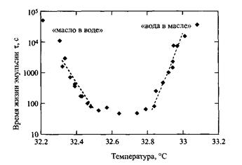 При эмульгировании в присутствии НПАВ капли образующейся эмульсии имеют наименьший размер вблизи температуры инверсии фаз вследствие понижения межфазного натяжения. Устойчивость эмульсий повышается при удалении от ТИФ; вблизи ТИФ эмульсии становятся неустойчивыми. Представлена зависимость времени жизни эмульсии от температуры для системы СЕб-и-октан-вода