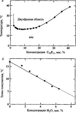 Помутнение и фазовое поведение служат примерами этих необычных температурных эффектов. Как правило, можно ожидать, что смешиваемость двух веществ будет возрастать при более высоких температурах за счет значительного вклада энтропии в свободную энергию смешения. Для некоторых систем наблюдается обратное влияние температуры на растворимость, как, например, для оксиэтиленсодержащих растворенных веществ. Следовательно, мы имеем дело с нижней кривой взаимной растворимости и нижней критической точкой. Можно ожидать, что при повышении температуры до достаточно высоких значений обнаружится полное смешение, т.е. фазовое поведение системы будет описываться замкнутой линией.