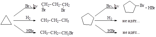 Химические свойства циклоалканов аналогичны реакциям алканов, но для малых циклов (циклопропан, циклобутан) характерны реакции присоединения с разрывом цикла.