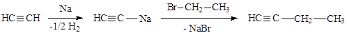 Благодаря ослаблению связи между атомами углерода и водорода ацетилен и его гомологи с концевым положением тройной связи могут вступать в реакции замещения с активными металлами (см. способы получения алкинов) и с оксидами металлов, проявляя слабые кислотные свойства (реакция является качественной на концевую тройную связь).