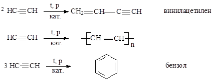 Димеризацией ацетилена получают винилацетилен (исходное вещество для синтеза некоторых диеновых полимеров), тримеризация приводит к бензолу, а полимеризация дает химически активные полимеры.