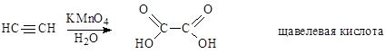 Окисление ацетилена водным раствором перманганата калия приводит к щавелевой кислоте. Обесцвечивание раствора КмnО4 является качественной реакцией на двойную и тройную связи.