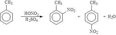 Алкилирование: Те же реакции замещения идут и для гомологов бензола, причем образуется смесь продуктов орто- и пара-замещения. Например, нитрование толуола приводит к орто- и пара-нитротолуолу: