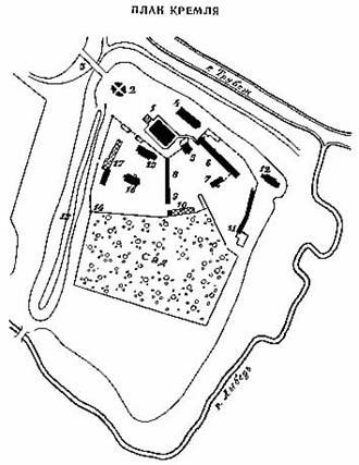 1 - Успенский собор; 2 - Колокольня; 3 - Мост; 4 - Христорождественский собор; 5 - Архангельский собор; 6 - Дворец Олега; 7 - Певческий корпус; 8 - Консисторский корпус; 9 и 10 - Хозяйственные постройки: сарай дл разной поклажи; кузница и бочарня, конюшня; 11 - Гостиница черни (амбары); 12 - Церковь Святого Духа; 13 - Крепостной вал; 14 - Ограда Спасского монастыря; 15 - Церковь Богоявления; 16 - Спасо-Преображенский собор; 17 - Гостиница знати. |