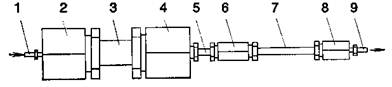 1—капилляр для подачи растворителя от насоса; 2—верхний фитинг резервуара; 3—резервуар для суспензии; 4—нижний фитинг резервуара; 5—предколонка; 6—рассверленный под наружные диаметры колонки и предколонки фитинг; 7—колонка; 8—фитинг колонки; 9—слив растворителя в мерный цилиндр