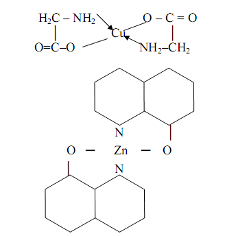 Внутрикомплексные соединения (ВКС) – координационные соединения металлов с одинаковыми или различными бидентатными (обычно-органическими) ацидолигандами, связанными с одним и тем же атомом металла комплексообразователя через одну отрицательно заряженную и одну нейтральную донорные группы с образованием одинаковых или различных внутренних металлоциклов (хелатных циклов), не содержащие внешнесферных ионов и являющиеся комплексами-неэлектролитами. Примером ВКС могут служить глицинат меди (II) и оксихинолинат цинка: