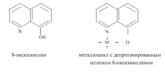 Примером может служить вышеописанный оксихинолинат цинка или оксихинолинат магния MgL2 (символом HL обозначена молекула 8-оксихолина), осаждающийся из растворов в виде осадка темно-зелёного цвета и используемы для определения магния.