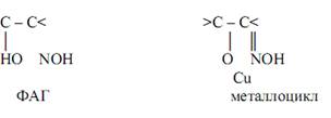 Так, например, ионы меди(II) Cu2+ при взаимодействии с органическими соединениями – α-ацилоиноксимами – образуют комплексы зелёного цвета, содержащие пятичленные металлоциклы: