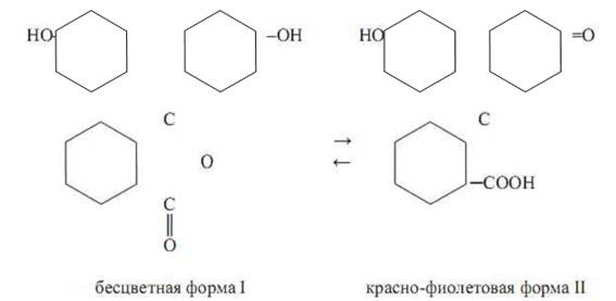Далее предполагается, что индикаторы в растворе могут присутствовать в разных таутомерных формах, находящихся в равновесии. В кислой среде доминирует одна таутомерная форма индикатора с какой-то, а в щелочной – другая таутомерная форма с иной хромофорной группой. Примером сказанного может послужить индикатор фенолфталеин, который в кислой среде бесцветен, а в щелочной окрашен в красный цвет. Согласно хромофорной теории предполагается, что в водном растворе фенолфталеина устанавливается равновесие: