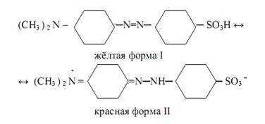 Таутомерная форма I имеет хромофор ─N=N─, придающий индикатору жёлтый цвет, а таутомерная форма II имеет другую хромофорную группу, придающую индикатору красный цвет.