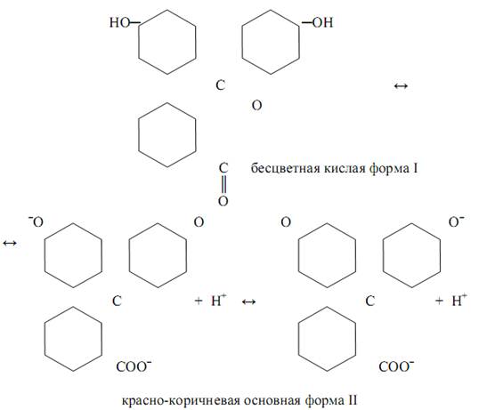 При изменении рН растворов, а именно при подкислении равновесие смещается влево – в сторону кислой формы и после понижения рН до такого значения рН1, когда в растворе доминирует эта форма, раствор принимает окраску формы I. При уменьшении концентрации ионов водорода равновесие смещается вправо – в сторону основной формы II. В случае индикатора фенолфталеина схему можно упрощённо представить следующим образом: