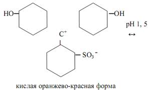 Таутомерная форма I не имеет хромофорной группы и поэтому бесцветна, а форма II обладает хиноидным хромофором и поэтому окрашена в красный цвет. Другой пример виден у индикатора метиловый оранжевый, который является натриевой солью диметиламиноазобензол-сульфокислоты (CH3 ) 2 N – C6H4– N=N – C6H4 – SO3Na. В водном растворе анион этой кислоты присоединяет протон и переходит в кислоту, которая подвергается превращению по схеме: