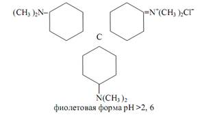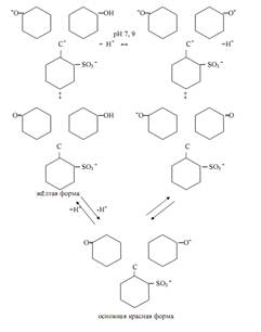 Кислая форма представляет собой нейтральную молекулу слабой кислоты HInd в какой-то таутомерной форме, основная форма IndˉB – это анион кислотной формы, которая является слабой кислотой в другой таутомерной форме. Хромофорные группы обеих таутомерных форм HInd и IndˉB неодинаковы, поэтому и окраска этих двух форм различна.