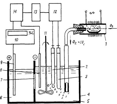 1-трубчатая печь; 2-измерительный электрод, 3-вспомогательный электрод; 4-электролитическая ячейка, 5-поглотительный раствор; б-вспомогательный раствор, 7-проницаемая для тока перегородка; 8- катод, 9-анод; 10-интегратор тока (пересчетное и индикаторное устройство); 11-мешалка, 12-высокоомныи усилитель рН-метра; 13-преобразователь "U→Тц", 14-стабилизатор тока.