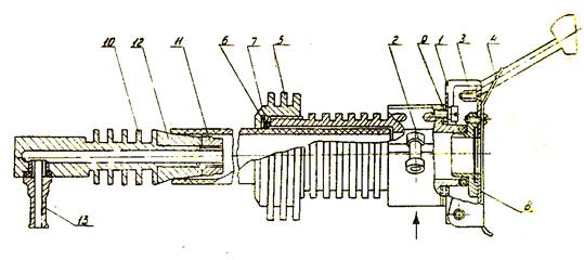 1-кронштейн; 2-штуцер; 3-крышка герметизирующая; 4-крышка запирающая; 5-гайка накидная; 6-шайба; 7,8-кольцо резиновое; 9-прокладка; 10-корпус пробки; 11-гайка; 12-пробка резиновая; 13-отводной штуцер.