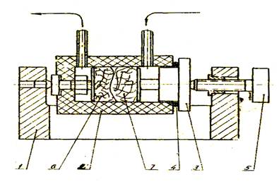 Фильтр (рис.6) состоит из основания (1), корпуса (2) с двумя штуцерами, крышки (3) и прокладки (4). Корпус, крышка и прокладка сжимаются винтом (5), заворачиваемым в гайку, закреплённую в основании.