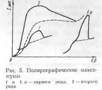 Максимумы на полярограммах. Во многих случаях вместо нормальной полярограммы, имеющей форму ступени, получается кривая с максимумом