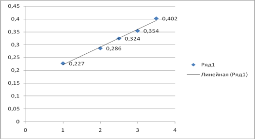 Рисунок 2.4 Зависимость оптической плотности A (ось ординат) от концентрации c∙10-5 (ось абсцисс) для стандартных растворов арсената