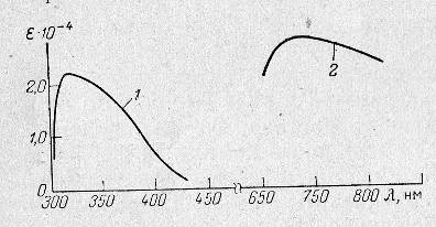 Рисунок 2.1 Спектры поглощения желтого(1) и синего(2) мышьяковомолибденовых комплексов