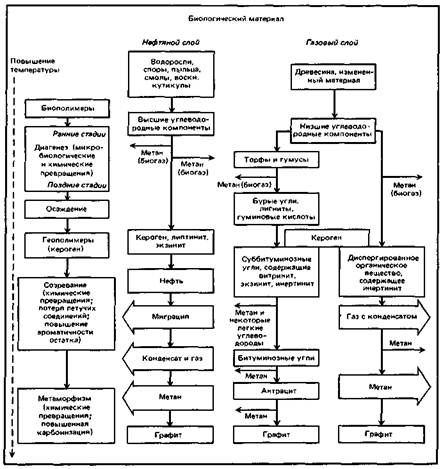 Образование углеводородных ископаемых, согласно современным воззрениям, происходило в результате протекания сложной последовательности геохимических процессов (см. рис. 1) внутри исходных газонефтеродных горных пород. В этих процессах составные части различных биологических систем (веществ природного происхождения) превращались в углеводороды и в меньшей степени в полярные соединения с различной термодинамической устойчивостью - в результате осаждения веществ природного происхождения и последующего их перекрывания осадочными породами, под влиянием повышенной температуры и повышенного давления в поверхностных слоях земной коры. Первичная миграция жидких и газообразных продуктов из исходного газонефтеродного слоя и последующая их вторичная миграция (через несущие горизонты, сдвиги и т. п.) в пористые нефтенасыщенные горные породы приводит к образованию залежей углеводородных материалов, дальнейшая миграция которых предотвращается запиранием залежей между непористыми слоями горных пород.