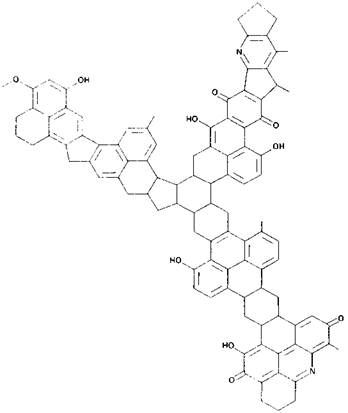 Рисунок 3 Вариант молекулярной модели низкосортного угля. Уголь представляет собой сложную смесь химических веществ, в состав которых входят углерод, водород и кислород, а также небольшие количества азота, серы и примеси других элементов. Кроме того, в состав угля в зависимости от его сорта входит различное количество влаги и различных минералов.
