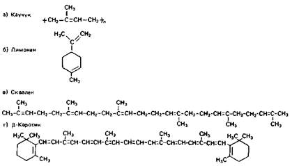 Углеводороды встречаются в природе не только в горючих ископаемых, но также и в некоторых материалах биологического происхождения. Натуральный каучук является примером природного углеводородного полимера. Молекула каучука состоит из тысяч структурных единиц, представляющих собой метилбута-1,3-диен (изопрен); ее строение схематически показано на рис. 4. Метилбута- 1,3-диен имеет следующую структуру: