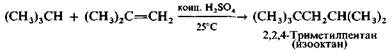 Алкилирование. В этом процессе алканы и алкены, которые образовались в результате крекинга, воссоединяются с образованием высокосортных бензинов. Такие алканы и алкены обычно имеют от двух до четырех атомов углерода. Процесс проводится при низкой температуре с использованием сильнокислотного катализатора, например серной кислоты: