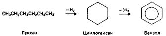 Циклизация и ароматизация. При пропускании бензиновой и лигроиновой фракций, полученных в результате первичной перегонки сырой нефти, над поверхностью таких катализаторов, как платина или оксид молибдена(VI), на подложке из оксида алюминия, при температуре 500°С и под давлением 10-20 атм происходит циклизация с последующей ароматизацией гексана и других алканов с более длинными неразветвленными цепями: