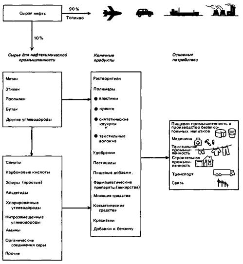 Приблизительно 90% всей добываемой нефти используют в качестве топлива. Несмотря на то, что та часть нефти, которая используется для получения нефтехимических продуктов, мала, эти продукты имеют очень большое значение. Из продуктов перегонки нефти получают много тысяч органических соединений (табл. 7). Они в свою очередь используются для получения тысяч продуктов, которые удовлетворяют не только насущные потребности современного общества, но и потребности в комфорте (рис. 6).