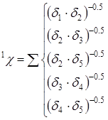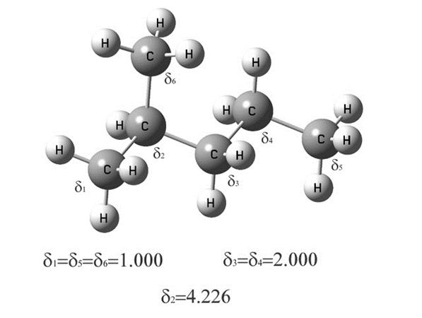 в молекуле выбираются цепочки из i+1 последовательно связанных атомов. Кодовые числа атомов, входящих в эти цепочки, перемножаются, и индексы молекулярной связности рассчитываются как суммы этих произведений, взятых в степени -0,5. Для приведенной молекулы 2-метилпентана расчет индексов