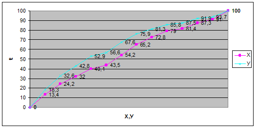 По имеющимся данным о равновесии между жидкостью и паром строим изобары температур кипения и конденсации смеси t=f(x,y) (Рисунок 1) и линию равновесия на диаграмме y=f(x) (Рисунок - 1).