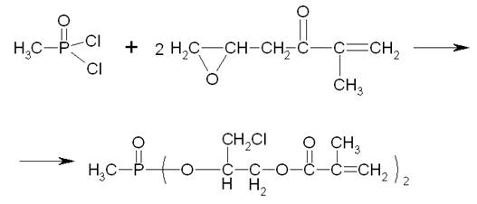 Аналогичный продукт – фосфорсодержащий диметакрилат. Он образуется в результате взаимодействия дихлорангидрида метилфосфоновой кислоты с глицидиловым эфиром метакриловой кислоты: