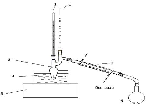 Установка состоит из колбы Кляйзена 2 с обратным водяным холодильником 3, силиконовой бани 4, термометров 1, электроплитки 5, а также приемника метанола 6.