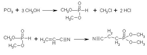 Образующийся как побочный продукт, метанол, используется для синтеза диметилфосфита (ДМФ), из которого, взаимодействием его с акрилонитрилом (в присутствии алкоголята натрия, при охлаждении), получают требующийся диметиловый эфир β-цианоэтилфосфоновой кислоты: