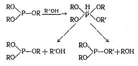 Равновесие реакции переэтерификации можно сдвинуть вправо и путем отгонки выделяющегося спирта. Этим приемом широко пользуются при получении разнообразных фосфитов, когда выделяющийся спирт кипит ниже исходного.