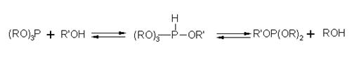 Механизм реакции переэтерификации эфиров кислот трехвалентного фосфора подробно не изучен. Предполагается, что механизм этой реакции состоит в чередующихся процессах присоединения протона к атому фосфора, алкоксил-аниона — к фосфоний-катиону и отщепления спирта от промежуточного продукта с пятивалентным фосфором с образованием исходного или другого фосфита или фосфинита: