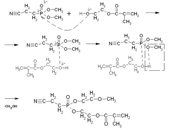 Таким образом, образуется новая связь между атомом фосфора и кислородом МЭГ. Причем эта связь более сильная, чем имеющаяся в эфире связь Р-О, которая ослабляется, и в конечном итоге разрывается, при этом образуется продукт неполной переэтерификации и молекула метанола.