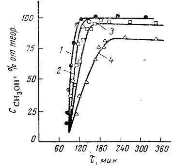 Рис. 3. Кинетика переэтерификации при различных температурахс катализатором Zn(OAc)2 + PbO (0,2%) 1 – 215 °С; 2 – 200 °С; 3 – 175 °С; 4 – 152 °С;