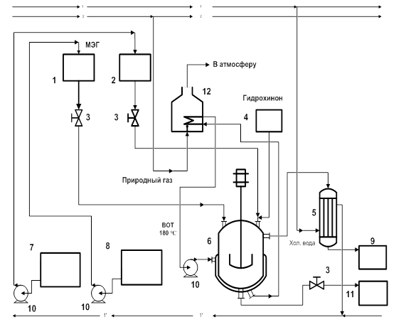 1-мерная емкость для МЭГ; 2-мерная емкость для эфира; 3- регулирующая запорная арматура; 4-весы для дозировки гидрохинона; 5- холодильник-конденсатор; 6-реактор; 7- емкость для хранения эфира; 8-емкость хранения МЭГ; 9-емкость для сбора метанола; 10-насосы; 11-емкость для целевого продукта переэтерификации ,12-трубчатая печь.