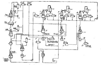 Первая кристаллизация. Пересыщенный раствор спускают в кристаллизатор 8, где в течение 8 ч идет процесс кристаллизации вначале при комнатной температуре, а затем через 4 ч при охлаждении, к концу процесса температуру доводят до 5° С.
