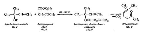 Метилгептенон (6-метилгептен-5-он-2). Получают его конденсацией диметилвинилкарбинола и ацетоуксусного эфира при температуре 160—165° С по следующей химической схеме:
